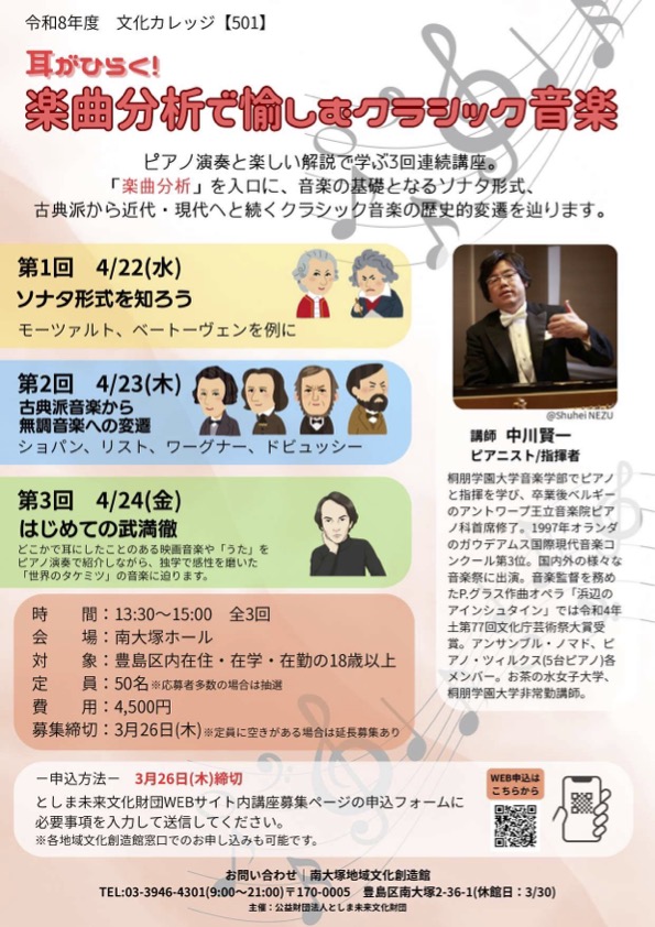 「楽曲分析」を入口に音楽の基礎となるソナタ形式、古典派から近代・現代へと続く歴史的変遷を辿ります。ピアノ演奏と楽しい解説で、クラシック音楽を一歩深く味わってみませんか。